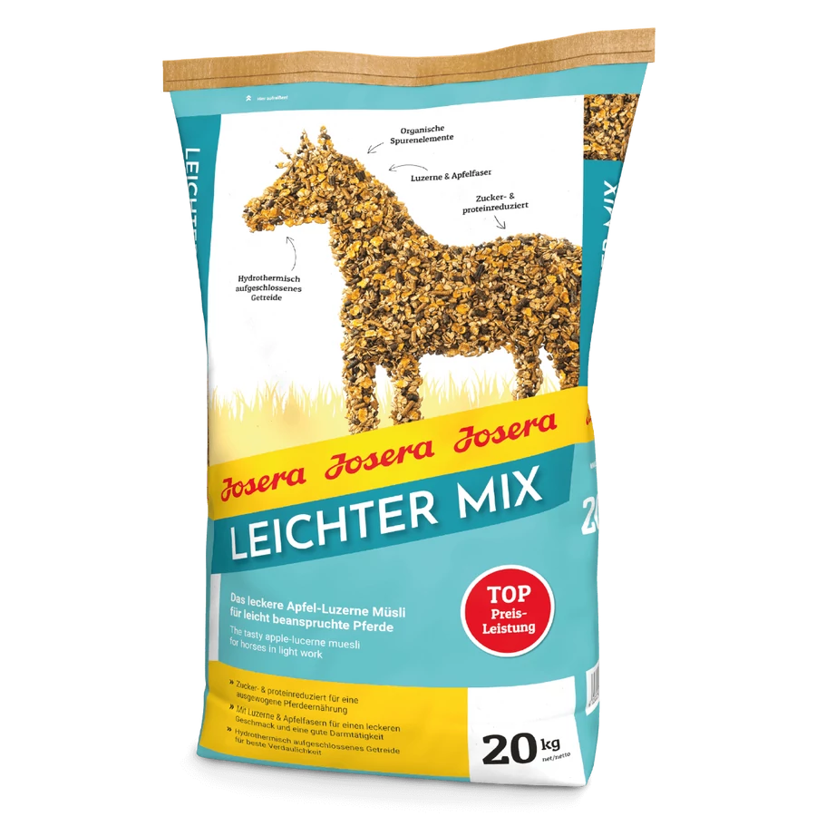 A JOSERA Leichter Mix egy csökkentett energiatartalmú, zabmentes takarmány, könnyű munkában lévő vagy pihenő lovak számára. Kiegyensúlyozott adag esetén (napi 2 kg Leichter Mix könnyű munkát végző nagyméretű lovak számára) nincs szükség ásványi kiegészítésre. A JOSERA Leichter Mix hidrotermikusan feltárt gabonapelyheket tartalmaz, melyek a vékonybélben könnyen emésztődnek. Magas rosttartalma visszafogja a szénhidrátanyagcserét és csökkenti az energiatartalmat.