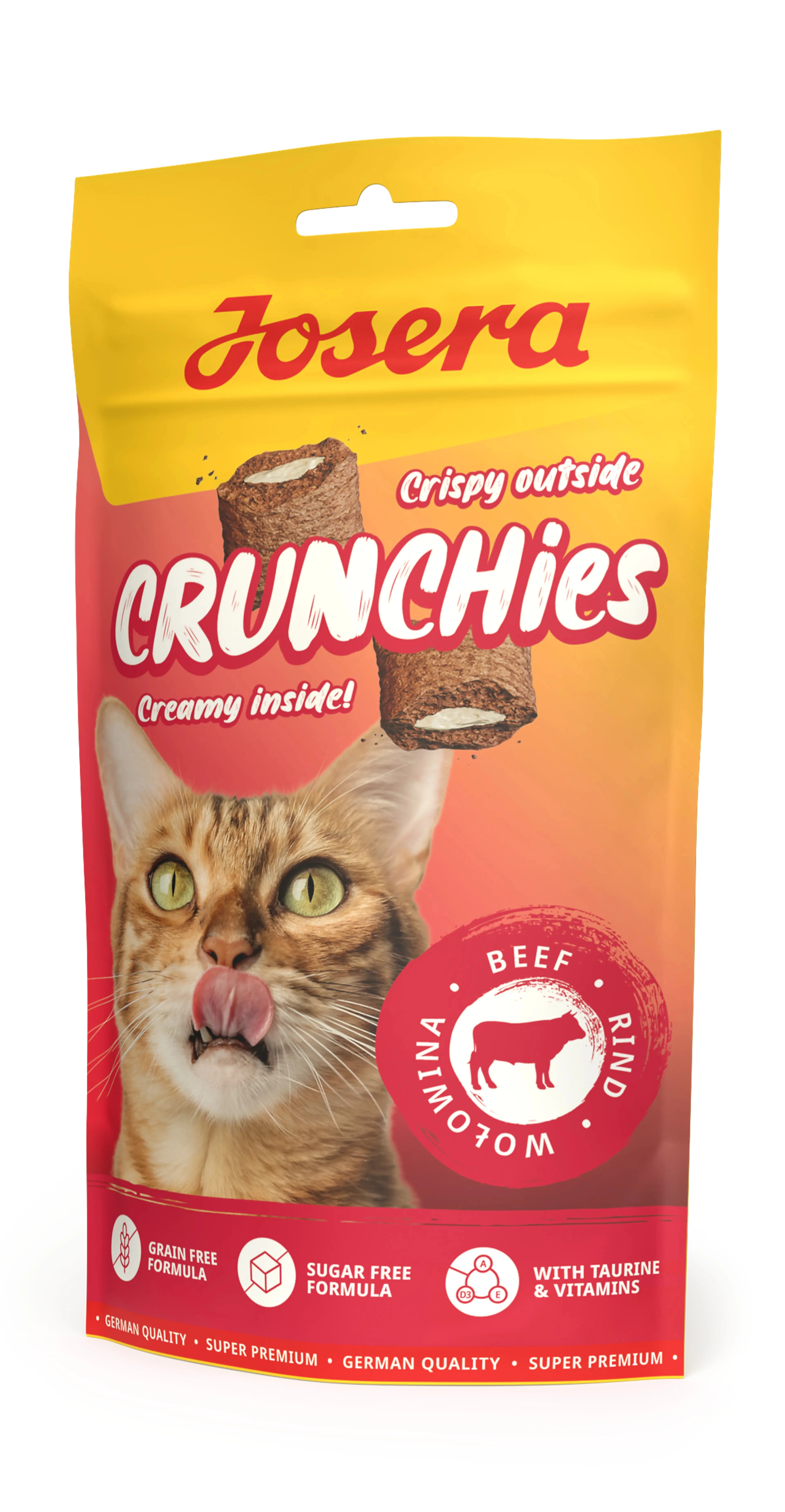 A Josera Crunchies Beef egy ropogós, gluténmentes csemege jutalomfalat marhahússal és krémes töltelékkel macskáknak.