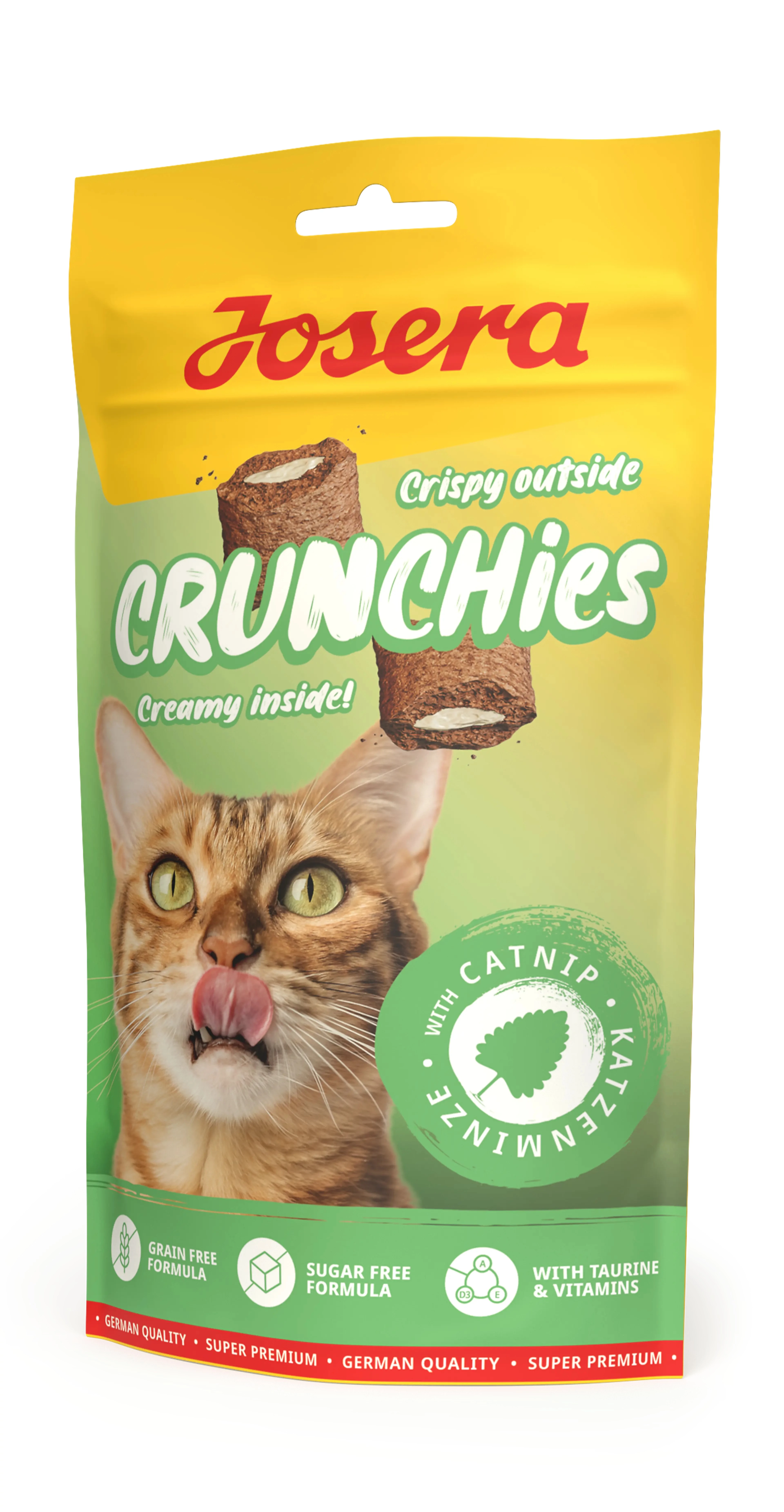 A Josera Crunchies with Catnip egy ropogós, gluténmentes csemege jutalomfalat macskamentával és krémes töltelékkel macskáknak. |