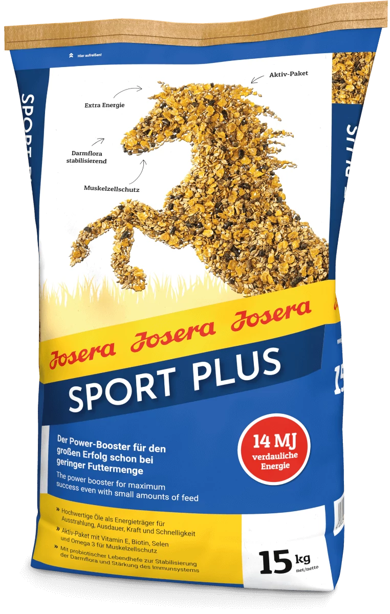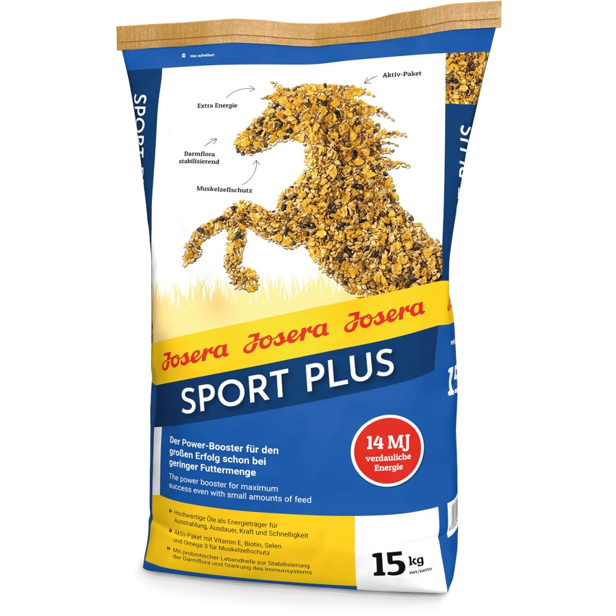 A JOSERA Sport Plus zabmentes magas energiatartalmú müzli-keverék, amely bármely területen alkalmazható a munkában lévő lovak számára. A JOSERA Sport Plus müzli energiatartalma kiemelkedő, értékes összetevőkben különösen gazdag, ezáltal a lovat kiváló kondícióban tartja. Az élő probiotikus élesztő a rostanyagok bontásáért felelős, vastagbélben élő baktériumokat támogatja, így csökkentve az emésztési zavarok előfordulásának kockázatát. A sport- és versenylovak esetében különösen fontos a magas terhelésnek, ezáltal oxidatív stressznek kitett izomsejtek védelme, ennek érdekében a müzli C-vitaminból, E-vitaminból és szelénből álló anti-oxidáns komplexet tartalmaz.