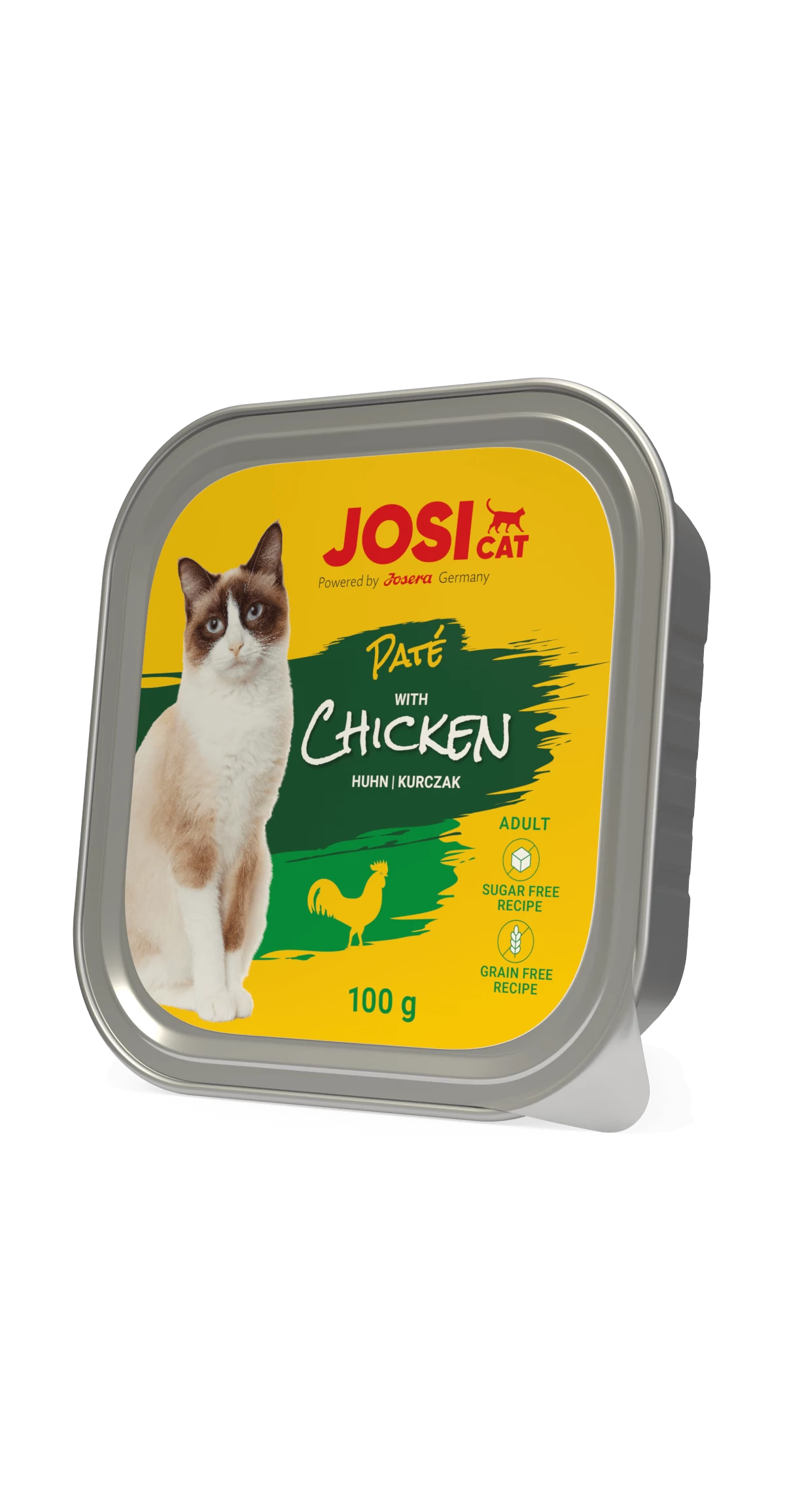 A JosiCat Paté Alu Chicken egy prémium minőségű, zamatos pástétom csirkével felnőtt macskák számára. |